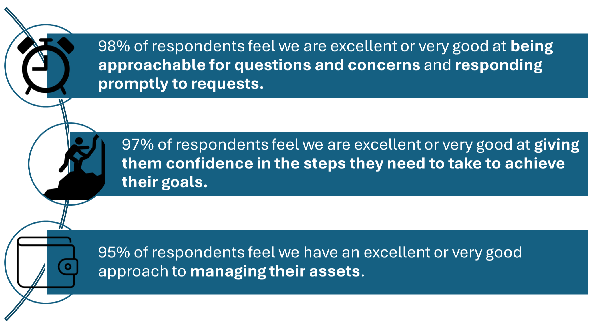 As a team, our intention is to provide premier service and utilize our broad capabilities to continuously meet your needs – so to ensure we’re doing that, we surveyed our existing clients in 2024 and asked for feedback on the customer experience we provide. A few highlights of our findings are below: